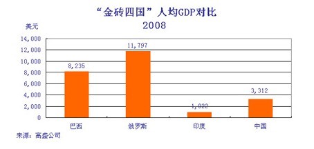 圖4:2008年金磚四國人均GDP對(duì)比。數(shù)據(jù)來源:高盛