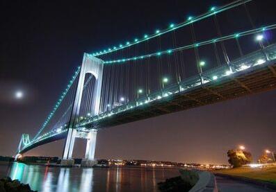 諸如尺寸小、使用壽命長、功耗低、易于調光和快速接通時間等好處已經(jīng)加速了高亮度LED在工業(yè)和住宅照明等很多已有照明應用中被采用。LED的長壽命和小尺寸使得在各種應用中引入新配置成為可能,這些應用包括在冰箱正面提供照明的白光LED陣列、以至照亮整個大學校園的更復雜系統(tǒng)等。以下圖顯示的是美國紐約Verrazano Narrows大橋,這個大橋完全由高亮度LED照明。LED的高效率極大地降低了所需的電力,而它們的長壽命和耐用性在相對苛刻的海洋環(huán)境中尤其重要。