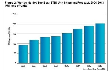 圖2所示為iSuppli公司對(duì)于2006-2013年全球STB出貨量的預(yù)測(cè)(單位:百萬臺(tái))