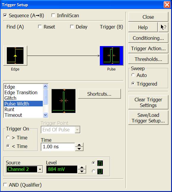 雖然許多問題只需使用邊沿觸發(fā)便可以輕松找出,但是有時(shí)工程師必須使用更復(fù)雜的觸發(fā)。其中,最簡單的觸發(fā)便是脈沖觸發(fā)。脈沖觸發(fā)被定義為一段高于(正脈沖)或者低于(負(fù)脈沖)某個(gè)閾值電平的時(shí)間。最常見的脈沖觸發(fā)是毛刺觸發(fā),它常用于對小于最小寬度的脈沖進(jìn)行觸發(fā)。這是一個(gè)違反觸發(fā)的實(shí)例,因?yàn)槭静ㄆ鳠o論在何時(shí)觸發(fā)都會指示出一個(gè)問題。