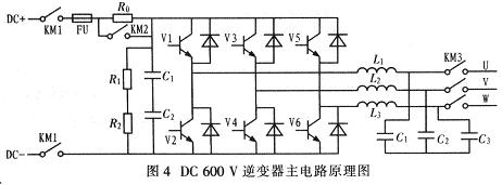 (3)由R0和KM2組成的緩沖電路,工作原理為:在輸入端施加電壓時,先通過緩沖電阻R0對電容充電。當電容電壓充到一定值時(比如540V),KM2吸合,將R0短路。只有電阻R0短路,三相逆變電路才能啟動工作。