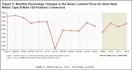 iSuppli公司認(rèn)為,第二季度訂單比第一季度增長15-16%,出貨量增長7-9%。這種趨勢與其它商品市場一致。但是,連接器領(lǐng)域補充庫存的勢頭不太強。圖5所示為亞洲每月連接器合同價格的百分比變動率,以代表市場趨勢的未來四個季度預(yù)測。