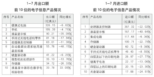 圖一:1~7月出口額(進(jìn)口額)錢(qián)10位電子信息產(chǎn)品情況