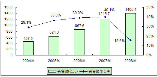 2008年,中國汽車電子市場繼續保持較快的增長態勢,但在汽車產量增速急劇回落的影響下,市場發展速度有所回落,成為2000年以來的一個低谷。全年汽車電子產品銷售額達到1405.4億元,比2007年同期增長15.6%。