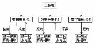 需要注意的是,當(dāng)觸點電壓為交流信號時,為了保證電壓有效值的計算精度,采集卡在一個工頻周期內(nèi)要完成16個采集通道至少320次的AD轉(zhuǎn)換,這就要求采集卡的采集速率非???,本裝置采用的是研華的PCL-818HG。每塊采集卡還提供了一個20-PIN數(shù)字輸出口,用來控制試品線圈回路的通斷電。試品觸點回路采用一塊多通道的數(shù)字量輸出卡,通過固態(tài)繼電器實現(xiàn)對兩組試品觸點回路的通斷電控制。繼電器可靠性檢測裝置的結(jié)構(gòu)框圖如圖1所示。