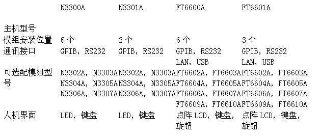 費思FT6600A和安捷倫N3300A各有兩款主機(jī),分別最大可支持6個模組和3個模組;具體如下: