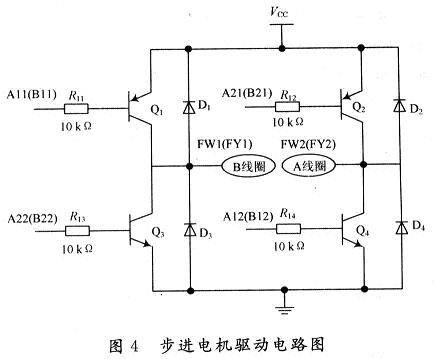 步進電動機是一種用電脈沖信號進行控制,并將電脈沖信號轉換成相應角位移的執行器。在跟蹤系統中,以74HC240的16個輸出信號作為步進電機驅動器的輸入控制信號,用以控制步進電機俯仰方向和水平方位的正反轉。圖4所示的是步進電機一路驅動電路圖,系統共有四路驅動電路,分別驅動步進電機俯仰方向和水平方位的正反轉。
