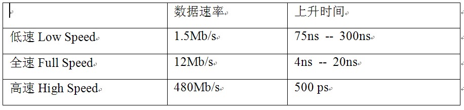 USB2.0是一種4線串行系統,包括VBus,D-,D+和地線,D-和D+是數據傳輸線,VBus和地線傳輸5V電壓。按照功能的不同,USB2.0產品可分為主機(Host)、設備(Device)和集線器(Hub)三大類。還可以根據供電方式的不同將USB2.0設備分為總線供電(從主機汲取電流)和自供電兩種方式。為了適應不同類型應用對數據傳輸速度的要求,USB2.0定義了三種速率級別,分別是:
