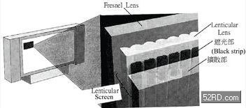LenticularLens除了可以收斂遮光部開口位置的光線之外,它還會將入射的影像光線擴散到水平方向,此外LenticularLens為了支援高解析度(HD)影像,因此要求非常微細的鏡片間距(LensPitch),因為粗大的鏡片間距可能會導致FresnelLens、LenticularLens與投影影像畫素出現波紋。
