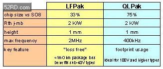 LFPak類似于Dpak等傳統的功率封裝,但是由于Dpak引腳和內部引線的電感,設計頻率始終無法突破200kHz 甚至更低的值。而LFPak 采用內部夾層構造,不再使用任何引線,從而在工作頻率方面取得了重大突破,今天的硅片可達到2MHz 。