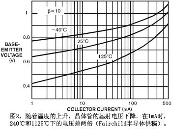熱與冷都會對電路造成負面影響。在極高溫下,芯片可能燒毀(圖1)。更常見的情況是,如果你的設計達到未曾預料的溫度,很多部件都可能超出規(guī)定極限。當出現這種情況時,電路就可能表現出難以預料的行為。另外一個情況也同樣值得關注,即電路溫度從熱到冷,然后又從冷到熱。這種狀況會造成熱沖擊,也會毀壞元件。很多工程師并不關心自己的電路在低溫下的性能,但這種忽視是一個錯誤。半導體器件的性能在低溫下會發(fā)生顯著變化。雙極晶體管的基射結電壓在低溫下會大大升高(圖2和參考文獻1)。AnalogDevices產品開發(fā)工程經理FranciscoSantos說:“如果你要設計一個能夠在負溫度下工作于1.8V的放大器,就要考慮當從室溫降到-40℃時,VBE(基射電壓)會增加130mV。這種情況將迫使設計者采用一組完全不同的放大器架構。”