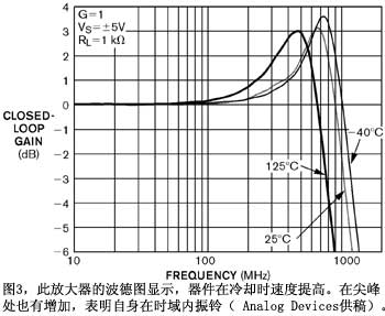 很多放大器,如AnalogDevices的AD8045,在冷卻時會加速(圖3),而有些放大器(如AD8099)則在變冷時會降速。已退休的LinearTechnology信號處理產品前副總裁兼總經理BillGross稱:“雙極晶體管在低溫下遇到的多數麻煩是低電壓工作。”他認為,較高的基射電壓和較小的電流增益都更難于滿足規(guī)格要求。他說:“較低的輸入阻抗和b(電流增益)的不匹配都會造成低溫下的大問題。尤其是當它們?yōu)槭覝剡\行作了調整時。較高的gm(跨導)很容易通過改變工作電流而得到補償,但這樣的話轉換速率就會變化。”