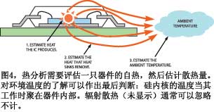 電路的熱分析分三個步驟。首先估計IC中產生的熱量。然后,估計電路板或散熱片散掉的熱量。最后,估計部件將要運行的環(huán)境溫度(圖4)。在估計元件產生的熱量時,DC分析通常沒什么價值。一只電壓為1V、流過1A電流的電阻器,會產生1W的熱量。但是,要估計交流或未確定的信號所產生的熱量就比較麻煩。首先,從電源端到接地腳的靜態(tài)電流總是在耗散一個直流功率。一個采用10V電源和5mA靜態(tài)