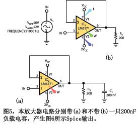 如果你能確定IC通過信號的特性,就可以用Spice來估算功耗。此時必須保證使用恰當的Spice模型,它們對一些測試信號給出合理的結果,而功耗計算此時沒有價值。圖5表示一個Spice圖。芯片的功耗不同于到達負載的功率。圖6是圖5示意圖的Spice曲線圖。它以紅線表示啟動的振蕩。電路是否會發(fā)生這種振蕩只是個人的猜測,但它應該會使你在建立原型后查看這種行為。記住,在OrcadCapture上點擊W鍵只能顯示芯片的靜態(tài)功耗。要獲得工作時的功耗,要用示意圖上的功率標記,然后用曲線程序的rms-math函數,給出器件的平均功耗。