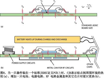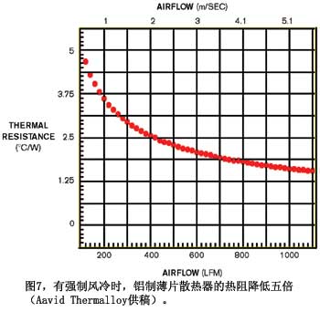 對流散熱也有一些困難。例如,氣流對商用散熱片的影響(圖7)。注意,在高溫下,熱阻會增加五倍。使用強制風冷的散熱片有較薄、間距更近的鰭片,比如一款風扇式CPU冷卻器。如果你的產品沒有風扇,則IC產生的熱量會傳導和散播出來,然后傳送到機內的空氣中。接下來,隨著整個機器溫度的上升,熱量通過對流傳送給周圍的空氣,如果你把機器放在腿上,則部分熱量也會傳導過來。外殼材料的熱阻就變得很重要。熱量從內向外的傳送速度,塑料殼要慢于金屬殼。