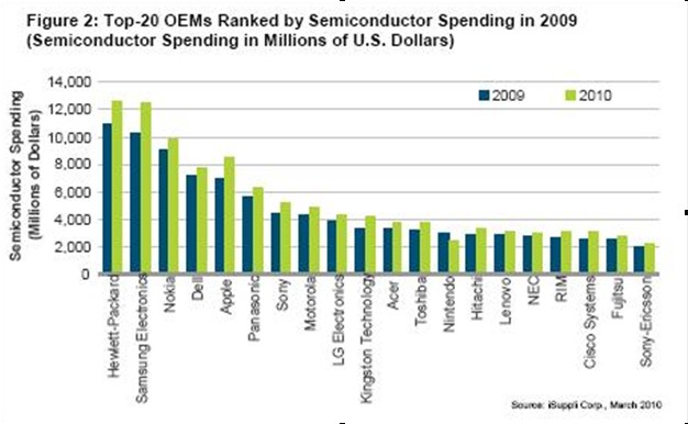 圖示為2009年和2010年20大OEM廠商的半導(dǎo)體支出,按2009年的支出水平排列。
