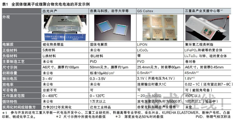 表1:全固體鋰離子或鋰聚合物充電電池的開發(fā)示例