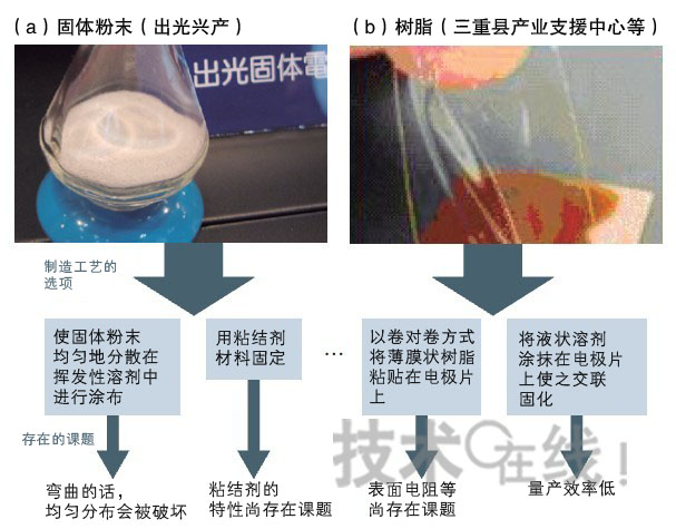 出光興產(chǎn)正在研究借助硫化物類粉末來(lái)形成均一電解質(zhì)層的方法(a)。三重縣產(chǎn)業(yè)支援中心等為了降低電解質(zhì)與電極片之間的表面電阻,目前正在研究在電極片上涂抹樹脂溶液后,通過(guò)交聯(lián)形成高分子的方法(b)。