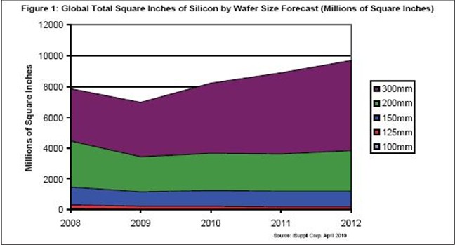 圖1所示為iSuppli公司對(duì)2008-2013年硅片面積總產(chǎn)量的預(yù)測(cè),按晶圓尺寸細(xì)分。