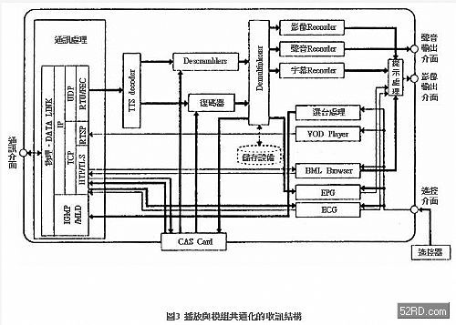 上述整合技術透過終端的共通化,可以實現系統的經濟化要求。圖3是播放與模組共通化的收訊機結構范例;圖4是支援次世代IPTV的數字電視機的實際外觀,它不需要傳統STB就能夠提供IPTV服務。