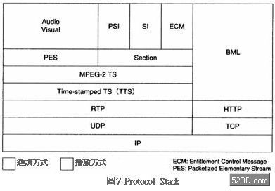 表1是次世代IP電視播放方式的諸元,該方式以標準數字播放為平臺,同時追加以IP網路傳送數字播放節目的內容。圖7是IP播放方式的ProtocolStack,如圖所示該ProtocolStack與數位播放一樣,可以利用TS(TransportStream)使多重化Stream收容在Multicast內。