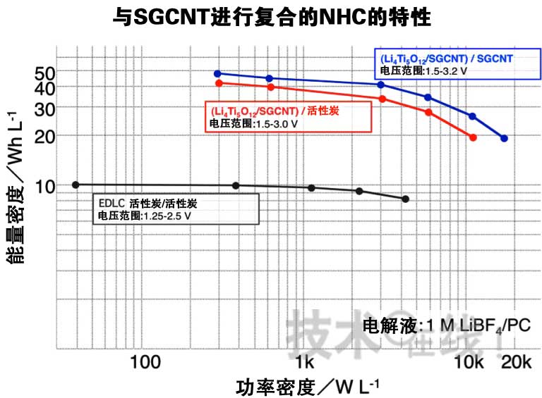 圖1:特性得到提高。綠線表示采用SGCNT、紅線表示采用活性炭作為正極材料時的特性