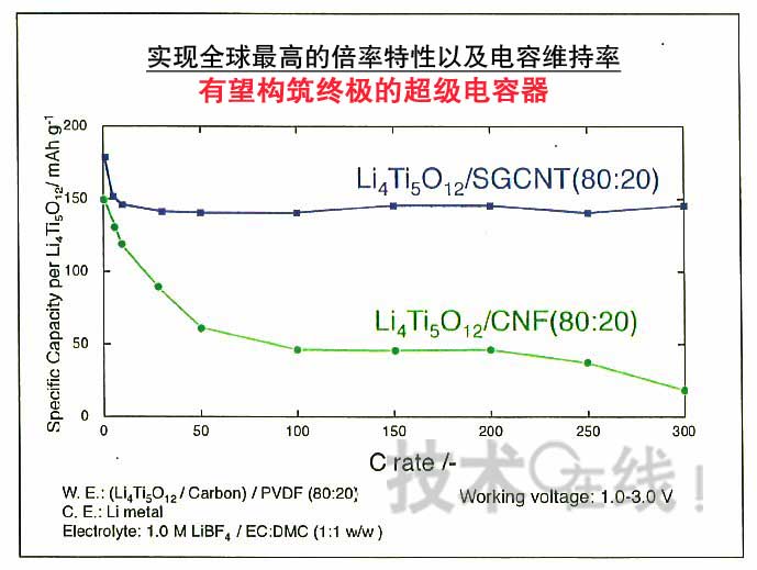 東京農(nóng)工大學(xué)研究生院于2009年3月宣布,開發(fā)出了采用碳納米纖維(CNF)與LTO復(fù)合而成的負(fù)極的鋰離子電容器,與以往的采用活性炭的雙電層電容器相比,實現(xiàn)了約3倍的能量密度。而且還表示,將完善由日本Chemi-Con定于2011年春季樣品供貨采用該技術(shù)的鋰離子電容器的體制。