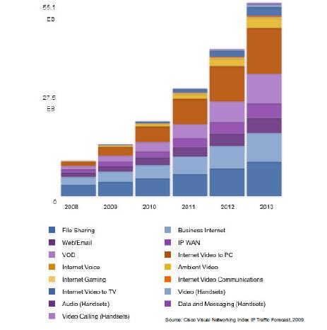 如圖1所示,從2007年到2012年,IP總流量將增加6倍,幾乎每兩年就翻倍。2012年之前,流量每年增長522exabytes(1018,即zettabyte的一半)。這種指數(shù)增長的主要推動力量是高清晰視頻和高速寬帶消費類應(yīng)用。
