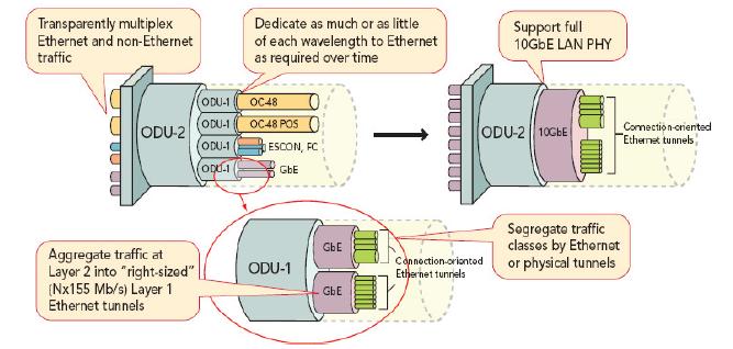 OTN含有的網(wǎng)絡(luò)功能和協(xié)議要求能夠滿足這些需求,以系統(tǒng)方式在光介質(zhì)上傳輸信息。本文重點介紹通過光纖承載傳送網(wǎng)和以太網(wǎng)載荷。建立同步數(shù)字體系(SDH)等OTN機制也在這一定義范圍之內(nèi),但是我們主要關(guān)注LAN到WAN的應(yīng)用,特別是40GbE和100GbE應(yīng)用(802.3ba)。出于這一標(biāo)準(zhǔn)化以及工作規(guī)劃的目的,所有OTN新功能以及相關(guān)技術(shù)都被認為是電信標(biāo)準(zhǔn)局(ITU-T標(biāo)準(zhǔn))的工作范疇。
