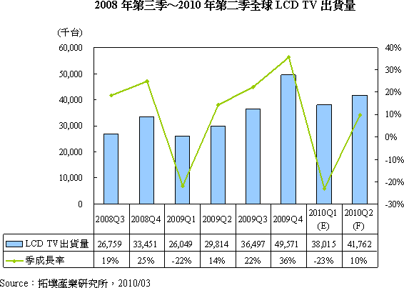 每年第一季歐美地區普遍缺乏節日刺激銷售,因此當季全球LCD TV出貨量往往呈現衰退狀況。雖然業界期望中國春節能改變第一季衰退的命運,但2010年春節中國市場LCD TV銷售量僅214萬臺,遠低于各界預估的400萬臺。拓墣產業研究所張乘維經理估計,2010年全球LCD TV首季出貨量僅3,802萬臺,較2009年第四季下滑23%。
