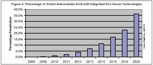 如圖4所示,到2020年,全球銷售的汽車中將有36.2%包含節(jié)能導(dǎo)航系統(tǒng),這是最受歡迎的節(jié)能駕駛輔助系統(tǒng)類型。2010年上述比例是0.7%。