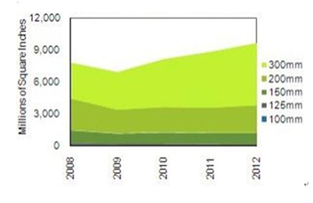 全球硅片市場(chǎng)按出貨面積計(jì), 在2009年下降11%, 而在2010年有望達(dá)到82億百萬平方英寸, 增長(zhǎng)17%。其中300mm硅片增長(zhǎng)最快為27%,達(dá)45億百萬平方英寸(MSI), 相比較200mm硅片增長(zhǎng)7%及150mm硅片在10%以下。