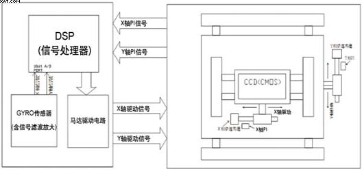 由圖2看出,在3D圖面上,Z軸有自動(dòng)聚焦功能,Z軸移動(dòng)對(duì)成像基本沒(méi)有影響,有影響是在X軸(PITCH)與Y軸(YAW)。圖4為在晚上拍照,無(wú)防手抖與有CCD防手抖的結(jié)果。圖5為CCD防抖系統(tǒng)框架,CCD防抖是在鏡頭上增加CCD支架,利用步進(jìn)馬達(dá)對(duì)X軸,Y軸的驅(qū)動(dòng),使CCD移動(dòng)來(lái)補(bǔ)償CCD的抖動(dòng)。MEMS陀螺儀選用要有X,Y軸Gyro芯片,內(nèi)部含放大,低通,高通濾波,這樣可以大大減少相機(jī)的尺寸。Gyro信號(hào)連DSP的ADport,DSP的AD是10bit,滿足設(shè)計(jì)要求。資料運(yùn)算用相機(jī)本身的DSP處理,可以減少一微處理器(Micro),降低成本。DSP對(duì)Gyro傳來(lái)的ω信息進(jìn)行運(yùn)算,計(jì)算補(bǔ)償量,通過(guò)馬達(dá)驅(qū)動(dòng)電路驅(qū)動(dòng)X,Y移動(dòng)來(lái)達(dá)到補(bǔ)償?shù)哪康摹軸,Y軸的PI信號(hào)是Lens反饋DSP信息來(lái)校正CCD與Lens中心重合,避免補(bǔ)償過(guò)程超出Lens設(shè)計(jì)的補(bǔ)償范圍。