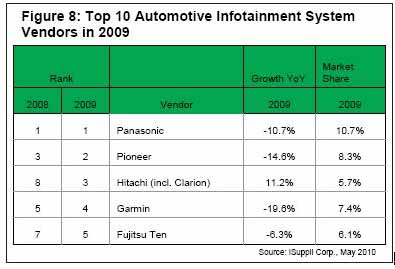 另一家日本一線供應商日立2009年排名第三。該公司2008年排名第八,是2009年10大廠商中營業收入增長的兩家廠商之一。日立2007年與Clarion Co. Ltd.合并,合并營業收入2009年占全球信息娛樂市場的5.7%。