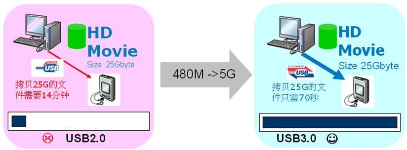 盡管USB2.0的速度已經(jīng)相當(dāng)快,對(duì)于目前高清視頻和TB級(jí)別的數(shù)據(jù)傳輸還是有些慢,在2008年11月,HP、Intel、微軟、NEC、ST-NXP、TI聯(lián)合起來(lái)正式發(fā)布了USB3.0的V1.0規(guī)范。USB3.0又稱為Super Speed USB,比特率高達(dá)5Gbps,相比目前USB2.0的480Mbps的速率,提高了10倍以上,引用Intel專家Jeff Ravencraft的話:“以25GB的文件傳輸為例,USB2.0需要14分鐘,而3.0只需70秒左右(如圖1所示)。”25GB,正好是單面單層藍(lán)光光盤的容量。USB3.0預(yù)計(jì)將在2011年逐漸在計(jì)算機(jī)和消費(fèi)電子產(chǎn)品上使用。