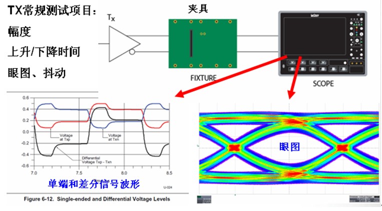 對(duì)于絕大多數(shù)高速串行信號(hào)的測(cè)量,通常包括了發(fā)送端測(cè)量和接收機(jī)測(cè)量,又稱為TX測(cè)量和RX測(cè)量。目前,對(duì)于板級(jí)設(shè)計(jì)的硬件工程師,對(duì)發(fā)送端測(cè)試已經(jīng)非常熟悉。通常使用高帶寬示波器加上測(cè)試夾具或差分探頭來(lái)測(cè)量,測(cè)試項(xiàng)目主要是眼圖、抖動(dòng)、上升/下降時(shí)間、幅度等等,探測(cè)點(diǎn)的位置一般是串行鏈路的發(fā)送端或接收端,由于測(cè)量的都是高速收發(fā)器芯片發(fā)送出的信號(hào),對(duì)于這一類測(cè)試通常都稱為發(fā)送端測(cè)試,如下圖2為典型的TX測(cè)試的示意圖。