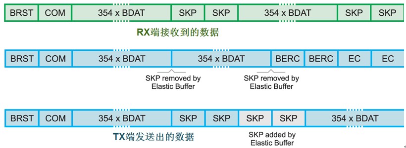 在USB3.0中,鏈路兩端的產(chǎn)品的參考時(shí)鐘頻率可能是不一樣的,參考時(shí)鐘允許的精度為+/-300ppm,SSC展頻引入的頻率偏差為0到-5000ppm,所以總的頻率偏差在-5300ppm到300ppm。為了補(bǔ)償頻率偏差,在USB3中的數(shù)據(jù)流中每354個(gè)symbol要插入兩個(gè)SKP(即K28.1碼),接收端需要能識(shí)別和刪除SKP,在USB3.0芯片中,添加和刪除SKP是由Elasticity Buffer來(lái)實(shí)現(xiàn)的(詳見USB3.0 Specification的6.4.3節(jié))。于是,在接收機(jī)測(cè)試時(shí),PUT發(fā)送出的碼流會(huì)加入一些SKP,誤碼檢測(cè)器接收到的數(shù)據(jù)包括了測(cè)試碼型和一些SKP,然后對(duì)比碼型發(fā)生器發(fā)送出的測(cè)試碼型,傳統(tǒng)的BERT會(huì)誤認(rèn)為測(cè)量到了誤碼。而力科的PeRT可以智能的添加和刪除SKP后,再來(lái)計(jì)算是否有誤碼。圖6為USB3.0的Elasticity Buffer處理SKP的示意圖。