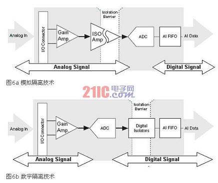 現今,許多商業現成可用(COTS)組件都含有上述隔離實現技術之一。對于模擬I/O通道,您可以在模數轉換器(ADC)完成信號的量化處理之前(模擬隔離)或之后(數字隔離)在設備的模擬部分實現隔離功能。根據您的隔離實現在電路中位置的不同,您需要依據其中的一種技術來設計不同的電路。您可以基于您的數據采集系統性能、成本和物理需求,選擇模擬或數字隔離技術。圖6a和6b展示了實現隔離功能的不同階段。