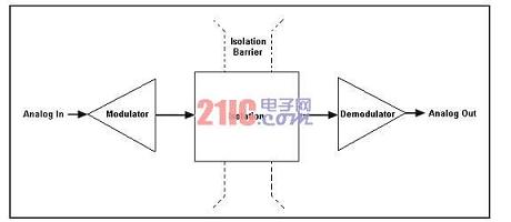 在一個理想的隔離放大器中,其模擬輸出信號與模擬輸入信號完全相同。圖7中標記為“隔離”的部分采用了之前章節中討論的技術(光耦合、電容耦合或感應耦合)之一,以跨過隔離層傳遞信號。調制器電路為隔離電路對信號進行預處理。對于光學耦合方法,您需要對該信號作量化處理,或將其轉換為變化的光強。對于電容耦合方法和感應耦合方法,您需要將該信號轉換為變化的電場或磁場。然后,解調器電路讀入隔離電路的輸出,并將其轉化回最初的模擬信號。