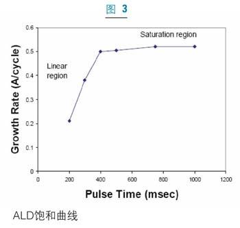 圖3中的飽和曲線說明了ALD過程的自約束特性。生長率隨脈沖時間呈線性增長,直到達到飽和條件。達到飽和以后,增長率為常數,且不再隨脈沖時間變化而變化。但是,如果同時存在一種寄生的CVD生長成分或反應物的分解的話,增長率就會顯著增加。因而,飽和曲線通常用來確定ALD的純度。ALD生長速率介于每循環0.3埃到1.5埃間。雖然ALD的生長速率在制備很薄的膜(<200埃)時還可以接受,但在用ALD生長厚膜時,生長周期就成為挑戰。