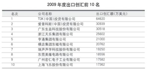 對(duì)于中國(guó)電子元件行業(yè)的外貿(mào)出口來說,2009年是一個(gè)從谷底緩慢爬升的過程。本屆元件百?gòu)?qiáng)中出口創(chuàng)匯總額為52.48億美元,同比下降10.38%,占銷售收入總額的28.81%,與上屆元件百?gòu)?qiáng)的出口總額相比,下降了9.83%。由于國(guó)際金融危機(jī)導(dǎo)致了外需萎縮,而且我國(guó)刺激內(nèi)需的各項(xiàng)政策效果明顯,一些元件百?gòu)?qiáng)企業(yè)開始更多地關(guān)注國(guó)內(nèi)市場(chǎng),所以本屆元件百?gòu)?qiáng)的出口創(chuàng)匯額雖然下滑,但整體銷售收入仍然獲得增長(zhǎng)。