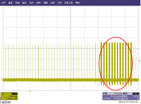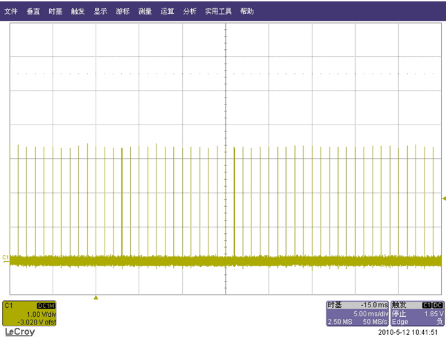 由于這些通信數(shù)據(jù)量的加大是突發(fā)出現(xiàn)的,用手動抓到的突發(fā)數(shù)據(jù)量波形很難剛好在時基觸發(fā)點附近,這樣波形放大后我們需要觀察的區(qū)域可能會無法滾進屏幕里,即使能滾進屏幕里,放大后的波形也可能由于時基、采樣等原因而失真的比較嚴重。而在一般情況下,我們都是考慮把觸發(fā)電平設置在如下圖“正統(tǒng)”的波形范圍里,但這樣也就抓不到“飛鳥”了:
