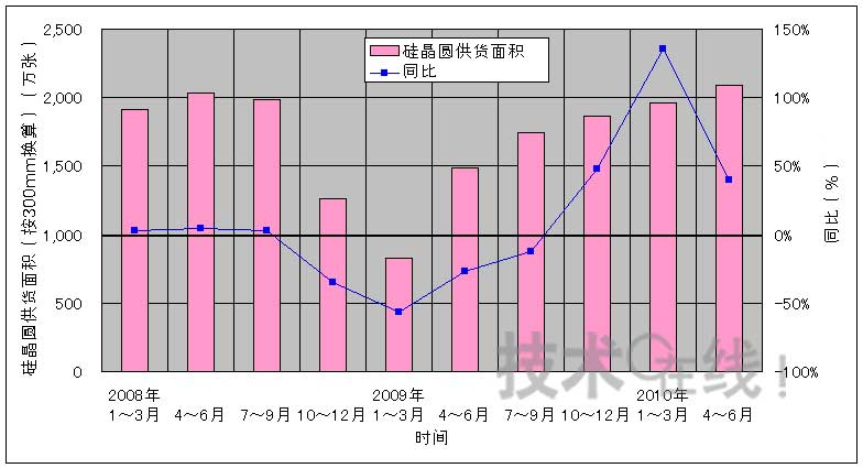 國際半導(dǎo)體制造設(shè)備材料協(xié)會(SEMI)公布了2010年第二季度(2010年4~6月)的全球半導(dǎo)體用硅(Si)晶圓供貨業(yè)績。發(fā)布資料顯示,硅晶圓供貨面積在2009年第一季度(2009年1~3月)觸底后連續(xù)五個月增加,突破了2000萬片(按300mm晶圓換算,下同)大關(guān)。超過了此前的歷史最高記錄——2008年第二季度(2008年4~6月)的1946萬片,刷新了歷史記錄。