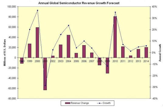 當2010年的增長與2000年相比時,要清楚此波周期的性質(zhì)與2000年時有明顯的不同,這是十分重要的。2000年的增長是由于1999年的產(chǎn)能迅速擴充以及不能持久的網(wǎng)絡(luò)泡沫增長來推動,所以2001年泡沫破裂,導致半導體業(yè)下降28.6%。相比2010年的增長是由于受2009年的外力突然打擊,產(chǎn)業(yè)自身增長的動力暫時被壓抑,因而在2010年半導體產(chǎn)業(yè)能迅速回復,包括在2011年能繼續(xù)增長。