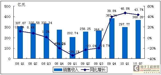 2010年上半年中國集成電路產(chǎn)量為302.5億塊,同比大幅增長了49.4%,行業(yè)實現(xiàn)銷售收入666.03億元。與2009年上半年458.99億元銷售額相比。增長了45.1%。上半年的高增長主要得益于國內(nèi)外市場的快速增長,以及去年上半年行業(yè)低谷的低基數(shù)效應(yīng)。整體來看,今年上半年產(chǎn)業(yè)銷售額不僅已恢復(fù)到2008年上半年的規(guī)模(2008年上半年產(chǎn)業(yè)銷售額為640.25億元),更在此基礎(chǔ)上實現(xiàn)了一定的增長。