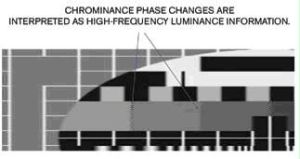 如果沒(méi)有發(fā)生亮度-色度分離,載波正循環(huán)或反循環(huán)時(shí),顏色信息使畫(huà)面更亮或更暗。同時(shí)顏色信息也會(huì)錯(cuò)誤地出現(xiàn)在圖像的黑白部分(圖2)。