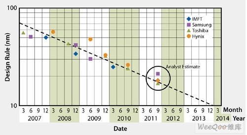圖1:NAND閃存技術(shù)的制造工藝幾何尺寸變化趨勢。