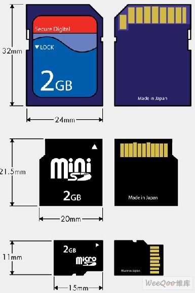 圖2:SD卡、miniSD卡和microSD卡的外形大小。
