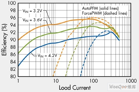 按照表1的計算,對于300mA的系統(tǒng),F(xiàn)AN5362能把功耗降至55mW;對于400mA的系統(tǒng),F(xiàn)AN5362能將功耗降至101mW。這些效率值根據(jù)所測得的FAN5362效率曲線而獲得。圖5顯示了AutoPFM(實線)和ForcePWM(虛線)的效率曲線。在優(yōu)化FAN5362效率的同時,選擇3MHz作為額定開關(guān)頻率,因為它能夠提供尺寸和效率之間的最佳權(quán)衡。從表1可看出,對于這種功耗敏感應(yīng)用,采用6MHz開關(guān)頻率時的功耗遠遠大于采用3MHz開關(guān)頻率時的功耗。
