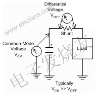 負載或電源的低壓側或高壓側都可進行電流檢測。共模電壓是指分路(shunt)上的電壓(不是分路上的差分電壓),在低壓側檢測為零伏。低壓側檢測最簡單,可采用最基本的放大器電路。低壓側檢測的難點在于:低壓側檢測會影響系統的接地端,可能還需要增加更多的線路,而且這種作法通常不利于故障診斷。圖1中的高壓側分路放大器可檢測很高的電源電壓上極低的差分電壓(通常為100mV或更低),通常在車載應用中為13.8V。不過,如果為無限制的(unconditioned)電池線路,那么會受瞬變影響:如果無意中將電池方向放錯就會出現–13.5V的情況,如果出現負載突降或感應反沖,那么最大瞬變可達72V。不妨設想,放大器通常采用5~12V的單電源供電(5V的電源供電日益常見),這就需要放大器的輸入引腳連接到共模電位,大大超過了放大器電源軌的限制。